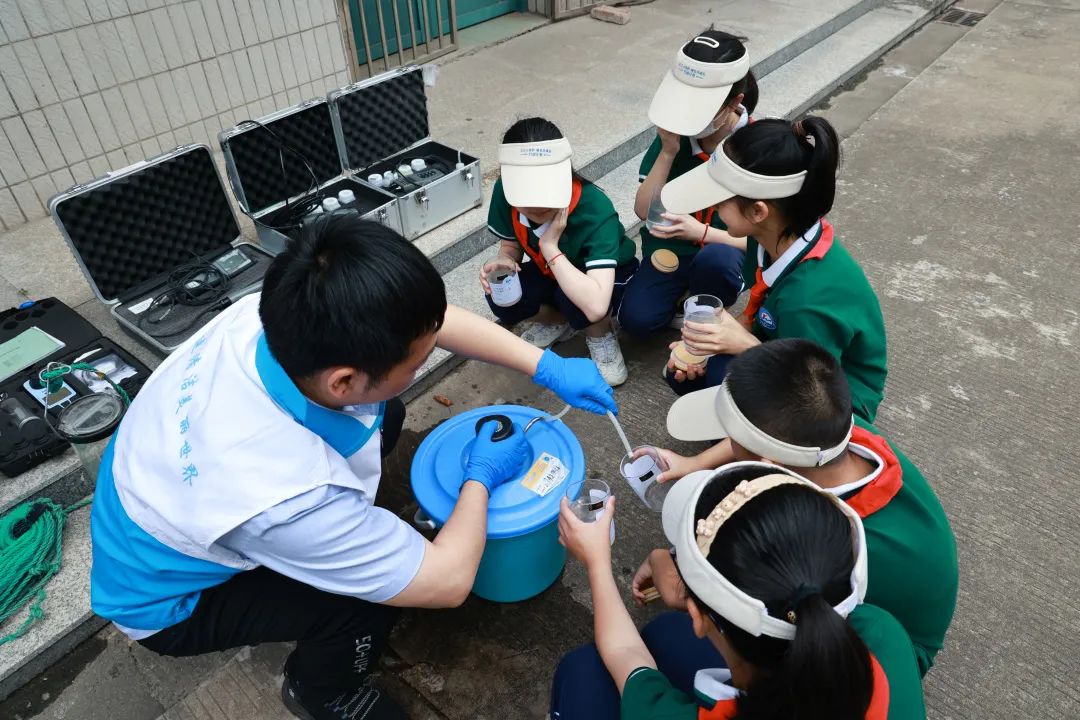 在水样采集样区,小使者们对监测仪器充满了好奇,早早地研究了起来,大家积极地向工作人员提出许多自己好奇的问题。在详细解释了水质透光率的知识后,工作人员现场提问了小使者相关问题,通过有趣的问答,小使者更好地理解了仪器的运作方式。