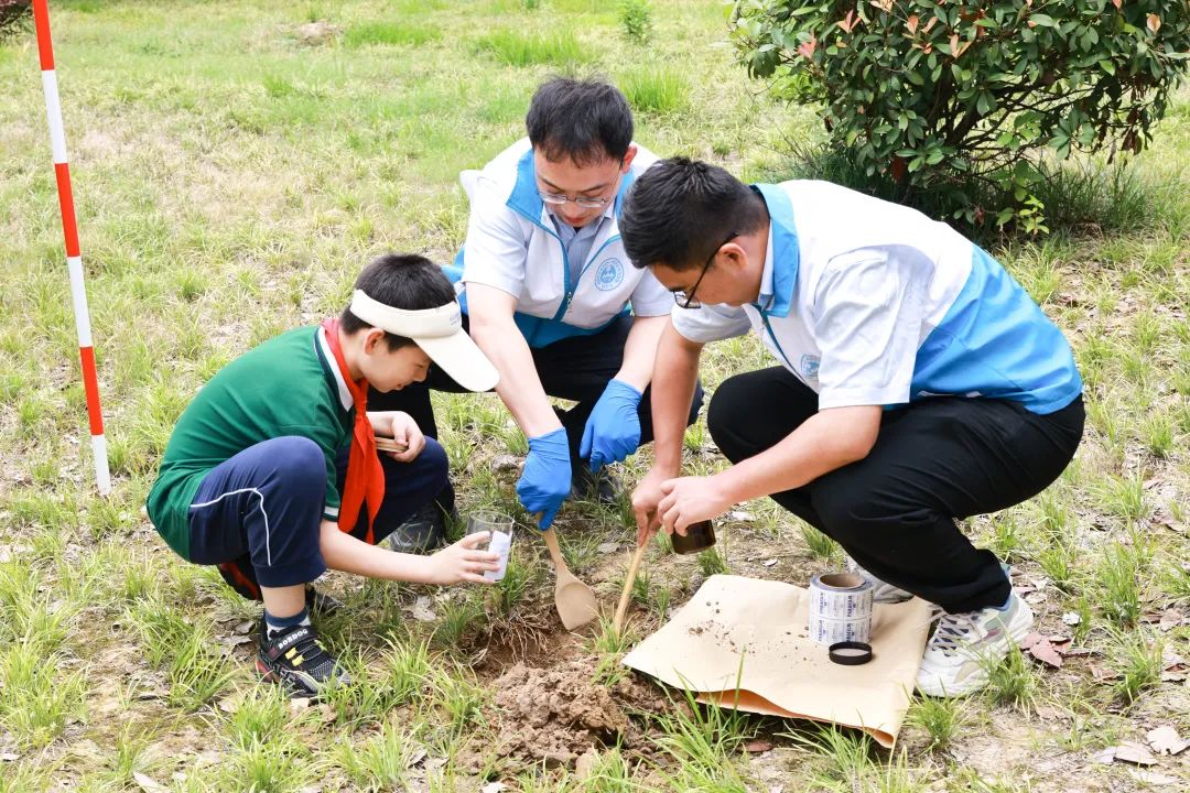 在土壤样品采样区,工作人员先将挖出深处的土壤,小使者发现了很多深层的土壤里的生物,大家在工作人员的指导下依次用小木铲挖取土壤样品,并在采样瓶上贴好了带有自己名字的标签。