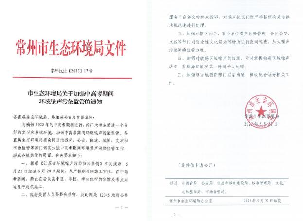 今天,江苏省2023年普通高校招生全国统一考试拉开帷幕,为给常州广大考生营造一个宁静舒心的复习、考试和休息环境,做好“宁静护考”工作,常州市生态环境局召开专题会议,印发《关于加强中高考期间环境噪声污染监管的通知》,及早部署、多向发力,开展“绿色护考”专项行动,切实加强中高考期间环境噪声污染监管工作。