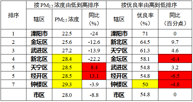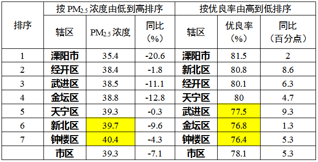 注:标黄的高于全市平均PM2.5浓度(低于全市平均优良天数比率)的数据,标红的为该项数据PM2.5浓度同比不降反升(优良天数比率不升反降)。