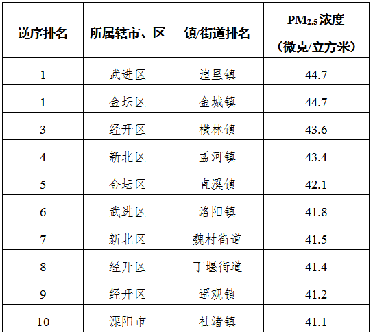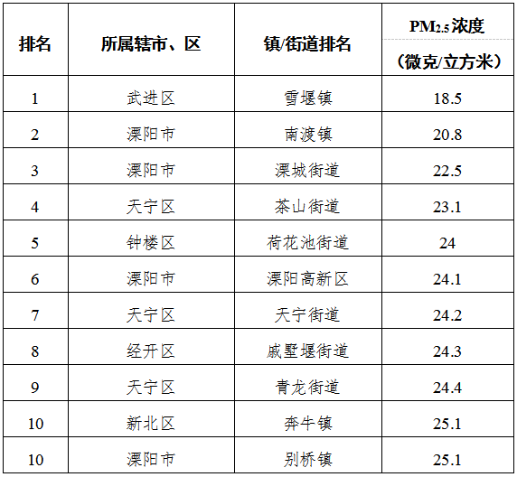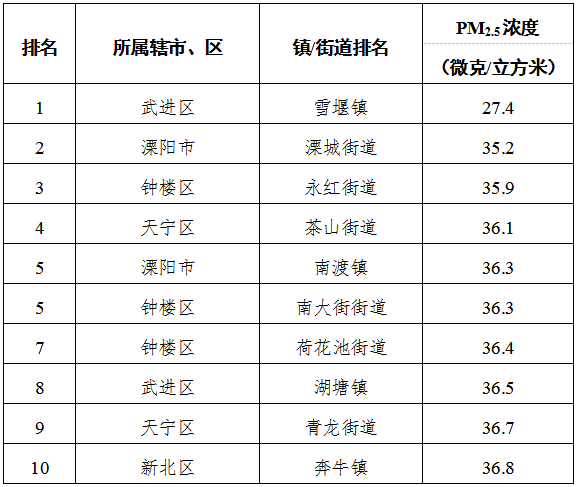 1-5月,全市63个镇(街道、园区)中,雪堰镇、溧城街道、永红街道等镇(街道、园区)PM2.5浓度相对较好(从第1名至第10名);湟里镇、金城镇、横林镇等镇(街道、园区)PM2.5浓度相对较差(从第1名至第10名)。