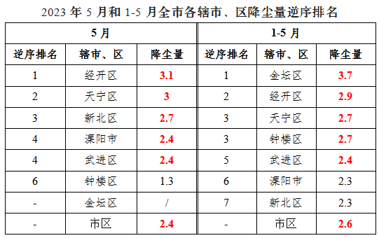 2023年5月,我市省考降尘量均值为2.4吨/月·平方公里,未达考核标准;2023年1-5月,我市省考降尘量均值为2.6吨/月·平方公里,对照《江苏省2023年大气污染防治工作计划》(苏大气办〔2023〕1号)中“常州市不得高于2.3吨/月·平方公里”的要求,未达到年度考核要求。各辖市、区中,5月,钟楼区达考核标准,其余均未达考核标准。1-5月,溧阳市、新北区达考核标准,其余均未达考核标准。
