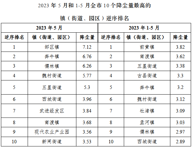 2023年5月,我市乡镇(街道、园区)点位降尘量均值为2.09吨/月·平方公里,1~5月,乡镇(街道、园区)点位累计均值为2.07吨/月·平方公里,均达到考核要求。2023年5月和1-5月全市63个乡镇(街道、园区)降尘量最高的10个乡镇(街道、园区)逆序排名如下表: