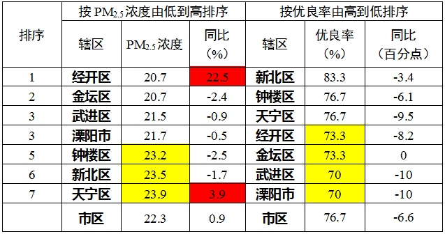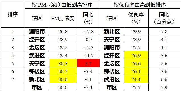 注:标黄的高于全市平均PM2.5浓度(低于全市平均优良天数比率)的数据,标红的为该项数据PM2.5浓度同比不降反升(优良天数比率不升反降)。