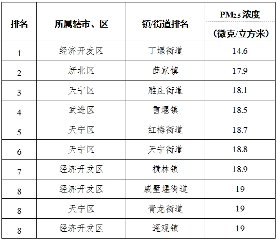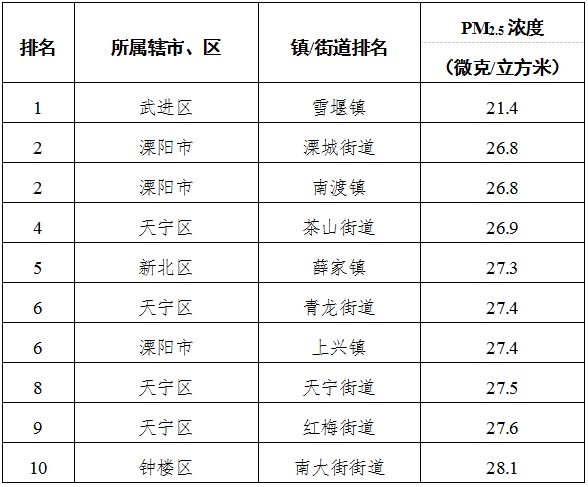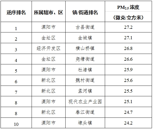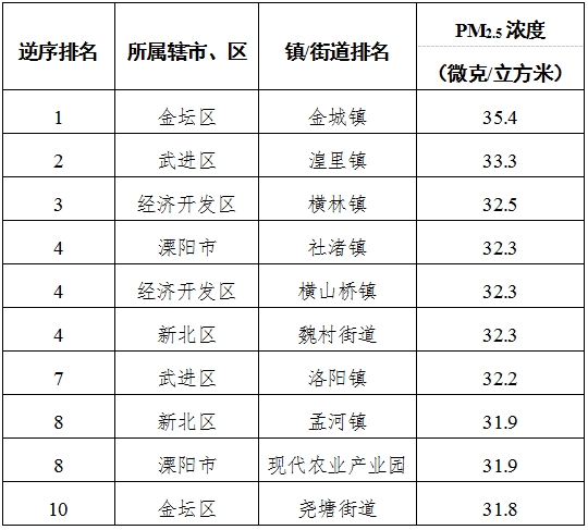 1-9月,全市63个镇(街道、园区)中,雪堰镇、溧城街道、南渡镇等镇(街道、园区)PM2.5浓度相对较好(从第1名至第10名);金城镇、湟里镇、横林镇等镇(街道、园区)PM2.5浓度相对较差(从第1名至第10名)。