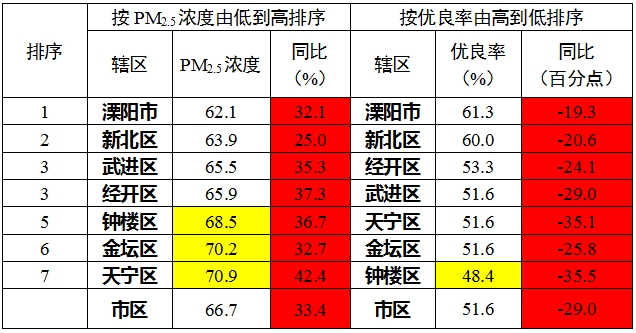 注:标黄的高于全市平均PM2.5浓度(低于全市平均优良天数比率)的数据,标红的为该项数据PM2.5浓度同比不降反升(优良天数比率不升反降)。
