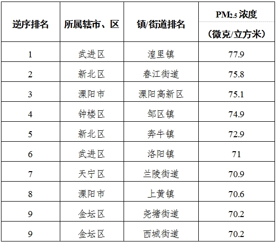 1月,全市63个镇(街道、园区)中,戴埠镇、雪堰镇、社渚镇等镇(街道、园区)PM2.5浓度相对较好(从第1名至第10名);湟里镇、春江镇、溧阳高新区等镇(街道、园区)PM2.5浓度相对较差(从第1名至并列第9名)。