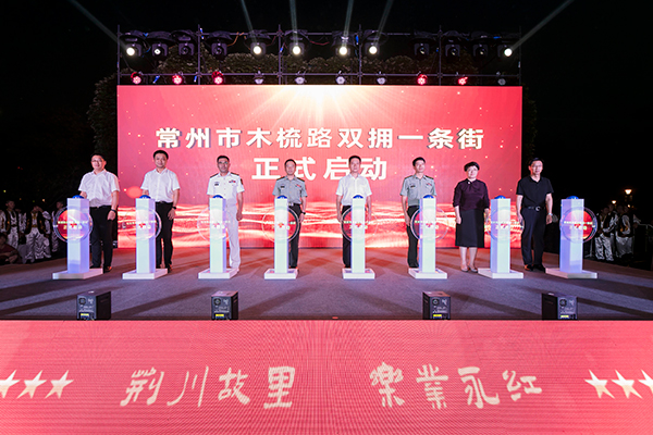 在欢歌笑语中迎来了本次活动第二个激动人心的时刻——常州市木梳路双拥一条街正式开启!在各级各部门的共同支持下,以木梳路双拥一条街为载体的拥军优属工作也进一步向全体现役退役军人家庭后方拓展,永红街道正式对外发布,实现全周期、全方位、全覆盖的服务保障。在上级领导按下启动柱之时,烟花四起,掌声雷动,全场沸腾!