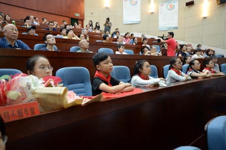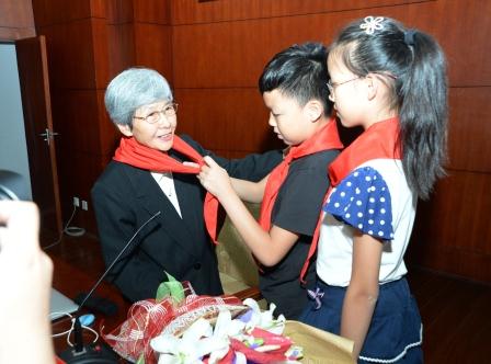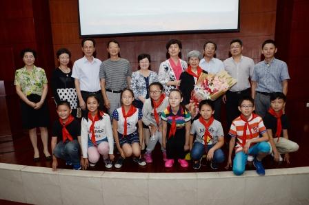 报告会结束时,定期为敦煌研究院捐款的局前街小学师生特邀代表为樊锦诗院长佩戴了红领巾并献上鲜花,表达了对她几十年如一日默默无闻、执着追求、无私奉献的莫大尊重与敬佩之情。
