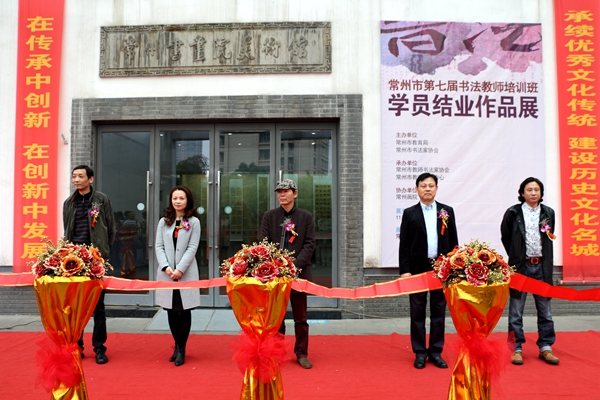 出席开幕式的领导嘉宾(从左至右):常州市书法家协会副主席李啸东,常州市教育局体卫艺术处副处长汤煜,常州市书法家协会副主席兼秘书长卢海洲,常州市教育局副局长张健,常州画院副院长吴鸣