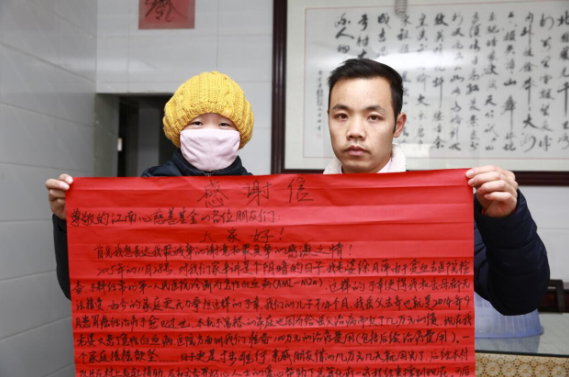 交流中,不难发现,虽然病魔缠身,但是从徐月萍带笑的眼角传达出的正能量深深感动了记者。徐月萍的丈夫韩垚拿出了写给江南心慈善基金爱心人士的一封沉甸甸的感谢信,“病魔无情,人间有爱,我老婆的生命是坎坷的,但她是幸运的,因为有江南心各位朋友的爱和真心在伴她同行!”