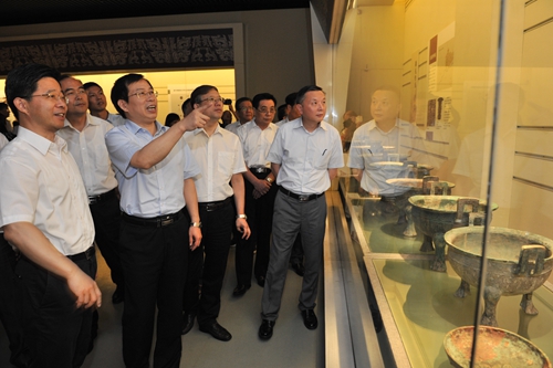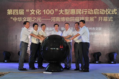 9月1日上午,常州市第四届“文化100”大型惠民行动启动仪式暨“中华文明之光——河南博物院藏瑰宝展”开幕式在常州博物馆举行,今年的“文化100”大型惠民行动由此拉开帷幕。 启动仪式由方国强副市长主持,市委常委、宣传部长、科教城党工委书记徐光辉,河南博物院院长马萧林分别致辞,市文广新局党委书记、局长荣凯元代表主办单位介绍本届“文化100”的有关情况,省文化厅副厅长吴晓林、市人大常委会副主任陈建国、市政协副主席吴新法、市政府副秘书长黄建德出席仪式,300多位市民参加了现场活动。