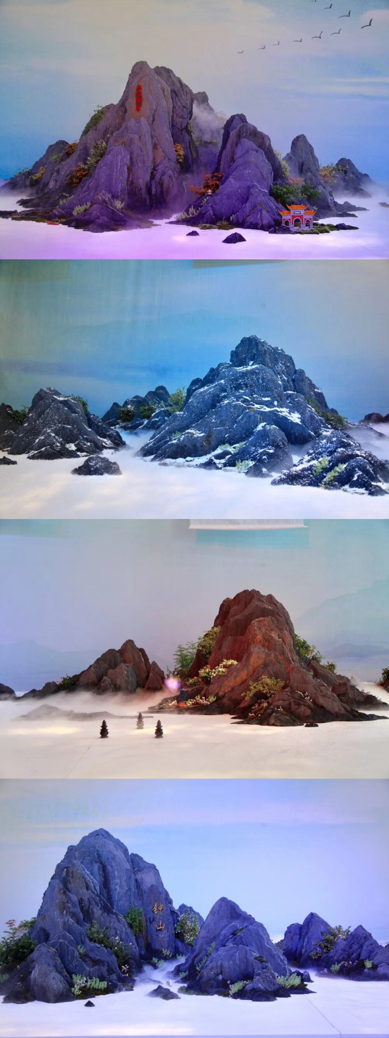 踏进展馆,第一眼注意到的作品就来自常州孟河魏氏斧劈石。魏达荣、魏玉宇父子创作的巨型盆景《京杭大运河》作为此次展览最巨幅作品,长18米,宽2.4米,从左往右地占满展厅视野内最显眼的一面墙体,惟妙惟肖地再现了大运河延绵千年、生生不息、时序交替、四季轮回的美景。山石崎岖、云海浩瀚,令人叹为观止。
