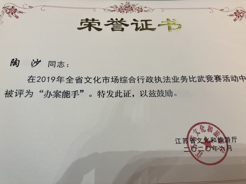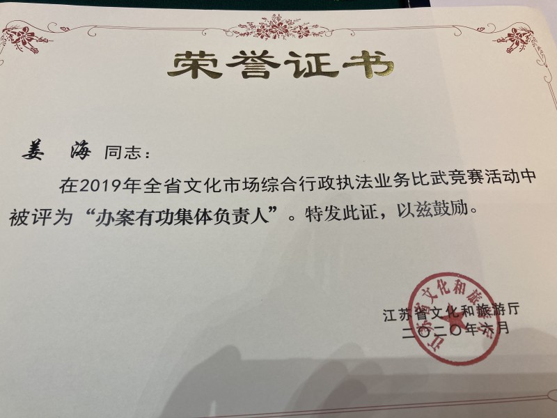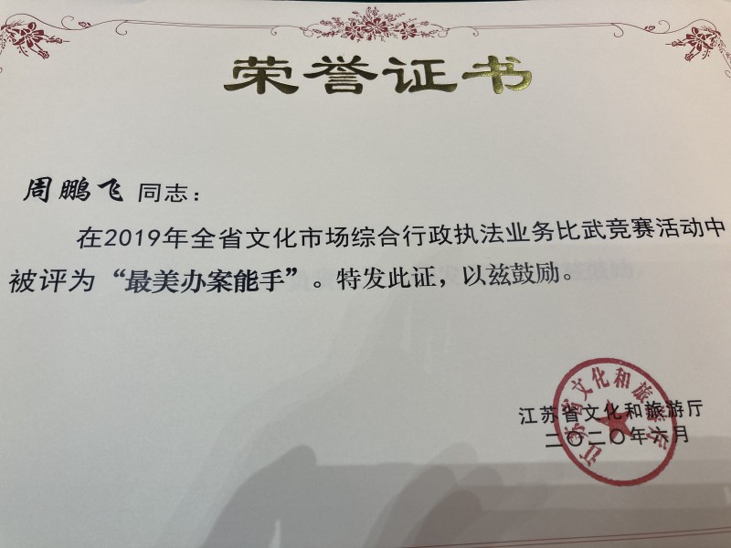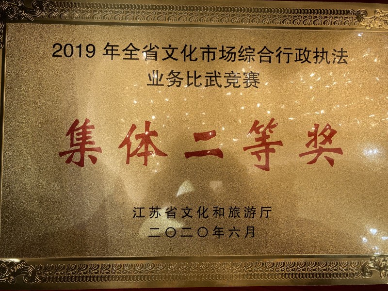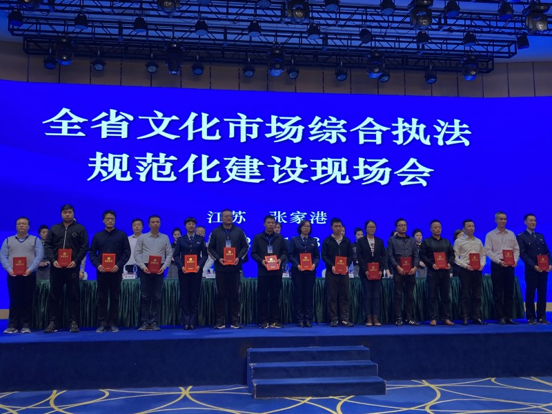 11月18日,全省文化市场综合执法规范化建设现场会在张家港市召开。会上宣读了2019年全省文化市场综合执法业务比武竞赛评审结果,并举行了颁奖仪式。常州市文化广电和旅游局荣获集体奖二等奖,常州市文化市场综合行政执法支队支队长姜海荣获办案有功集体负责人,执法队员周鹏飞荣获“最美办案能手”,执法队员陶沙荣获“办案能手”。