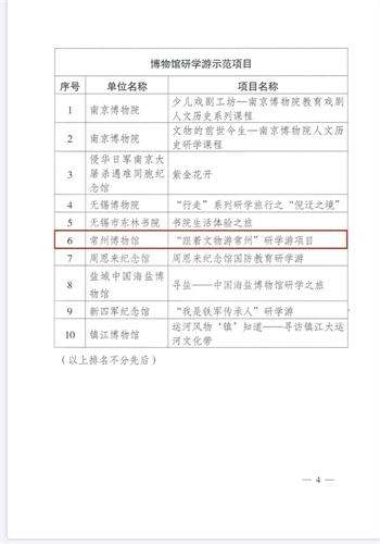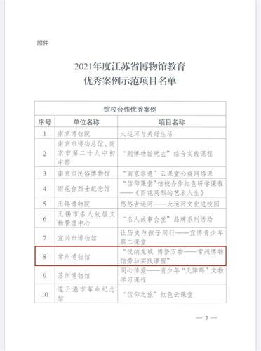 常州市文化广电和旅游局4月25日获悉,江苏省文物局发布《关于公布2021年度江苏省博物馆教育优秀案例示范项目的通知》文件,常州博物馆的“悦纳龙城 博悟万物——常州博物馆劳动实践课程”馆校合作项目、“跟着文物游常州”研学游项目在全省55个优秀案例中脱颖而出,双双入选2021年度江苏省博物馆教育优秀案例示范项目。全省共选出馆校合作示范项目10个、博物馆研学游示范项目10个。