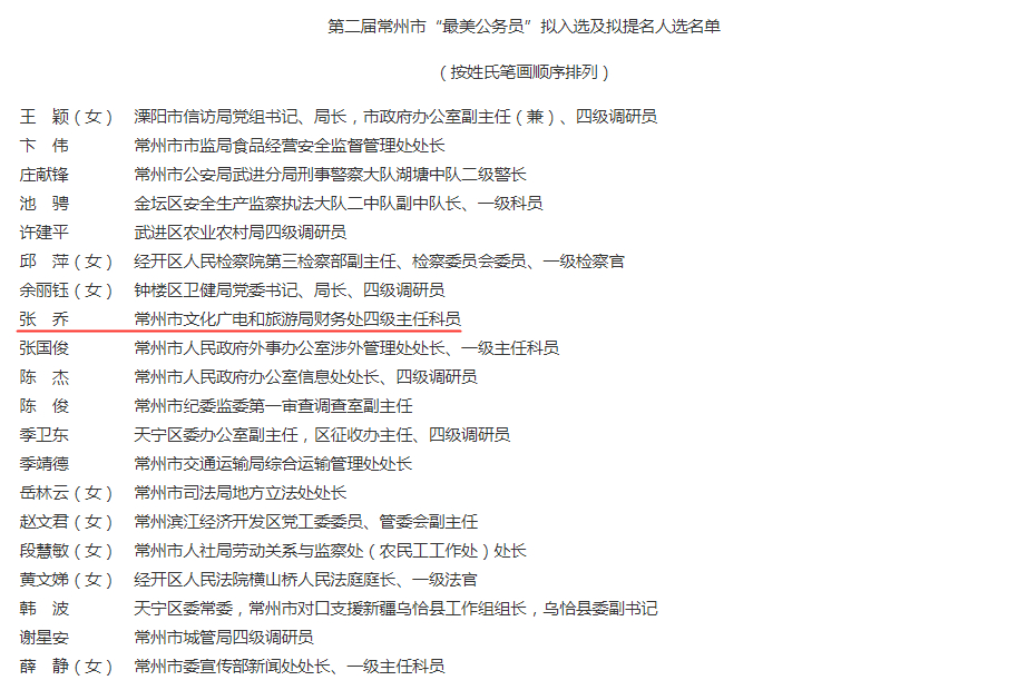 为弘扬常州公务员队伍担当奉献、建功新时代的积极形象,鼓励广大公务员崇尚先进、对标先进、争当先进,经推荐、审核、组织评审、征求意见、综合研判等程序,市委组织部于近日公示了第二届常州市“最美公务员”拟入选及拟提名人选共计20名,其中市级机关10名,市文广旅局财务处四级主任科员张乔入选。