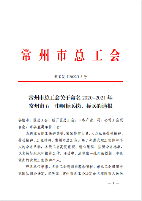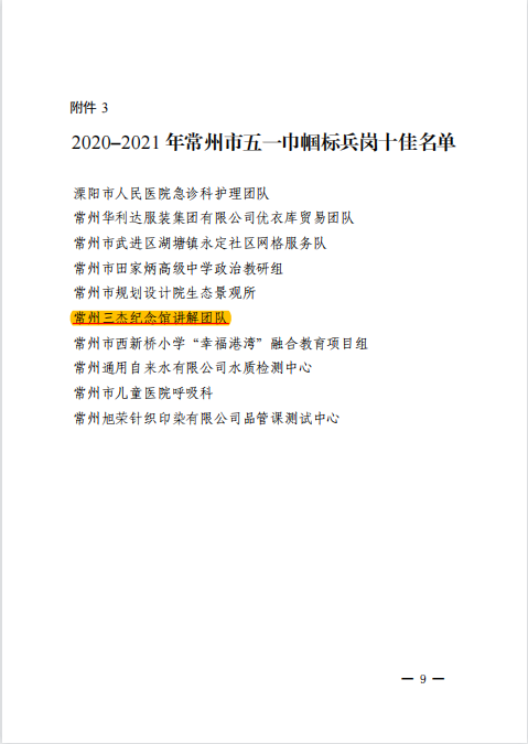 2022年1月27日,常州市总工会发文,对2020-2021年常州市五一巾帼标兵岗、标兵进行了通报,常州三杰纪念馆讲解团队获2020-2021 年常州市五一巾帼标兵岗十佳荣誉称号。