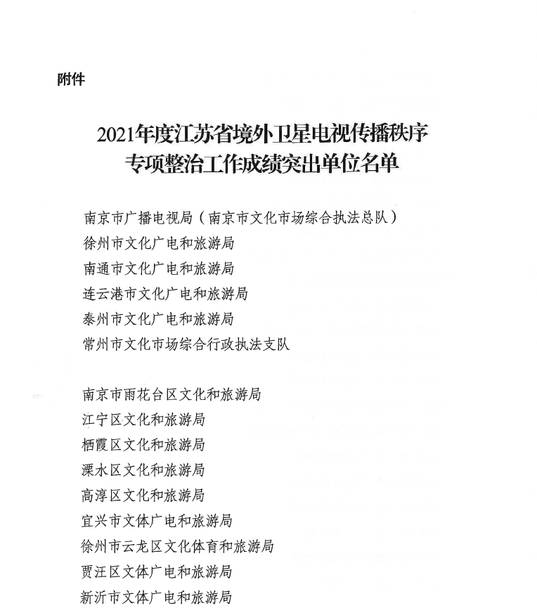 2021年以来,常州市文化市场综合行政执法支队为切实维护国家政治安全、文化安全和意识形态安全,迎接党的二十大胜利召开,认真落实国家广电总局和省局部署要求,扎实开展境外卫星电视传播秩序专项整治行动,行动中共出动执法人员113人次,共检查27家境外卫星电视接收单位,并积极配合公安部门捣毁非法销售境外电视网络接收设备黑色产业链1起,使传播秩序和渠道得到了进一步规范,维护了政治环境的安全、社会环境的安宁、文化市场的稳定。因整治成果显著,支队被省广播电视局评为2021年度江苏省境外卫星电视传播秩序专项整治工作成绩突出单位。