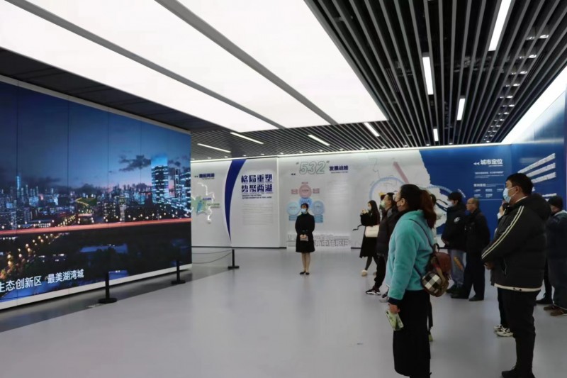“两湖”创新区规划展示馆,位于西太湖揽月湾,面积约9500平方米,以“生态创新区,最美湖湾城”为主题,以“新城市、新产业、新人才”为主线,设有序厅、六大主展厅、数字沙盘厅及尾厅,集中展示“两湖”创新区创新生态、产业生态、自然生态三生联动,科技之美、智造之美、青春之美交相辉映的美好蓝图和现实模样。
