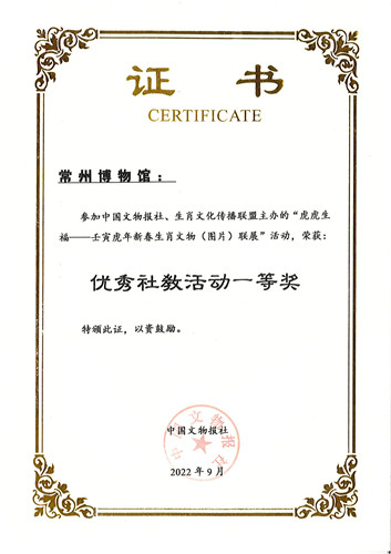 会上宣布了“虎虎生福——壬寅虎年新春生肖文物(图片)联展”的优秀参展单位获奖名单,常州博物馆“寅虎千年跃 22勇向前——2022年新春系列教育活动”在此次评选中荣获“优秀社教活动一等奖”。