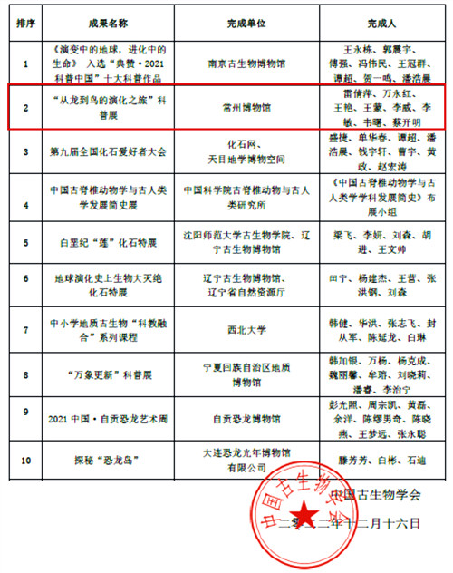 近日,由中国古生物学会科普工作委员会公布的“2021年度全国地质古生物科普十大进展”新鲜出炉,常州博物馆“腾飞之龙——从龙到鸟的演化之旅”特展成功入选,并名列第二。
