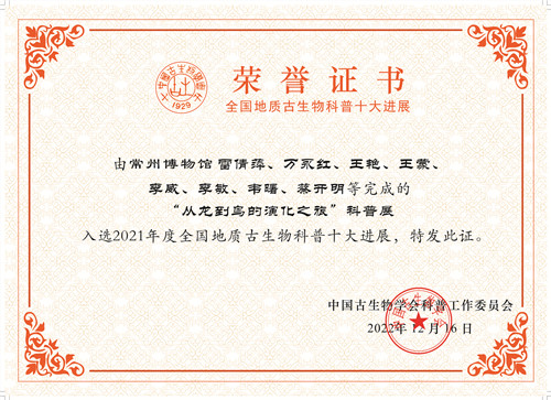 常州博物馆“腾飞之龙——从龙到鸟的演化之旅”特展入选2021年度全国地质古生物科普十大进展