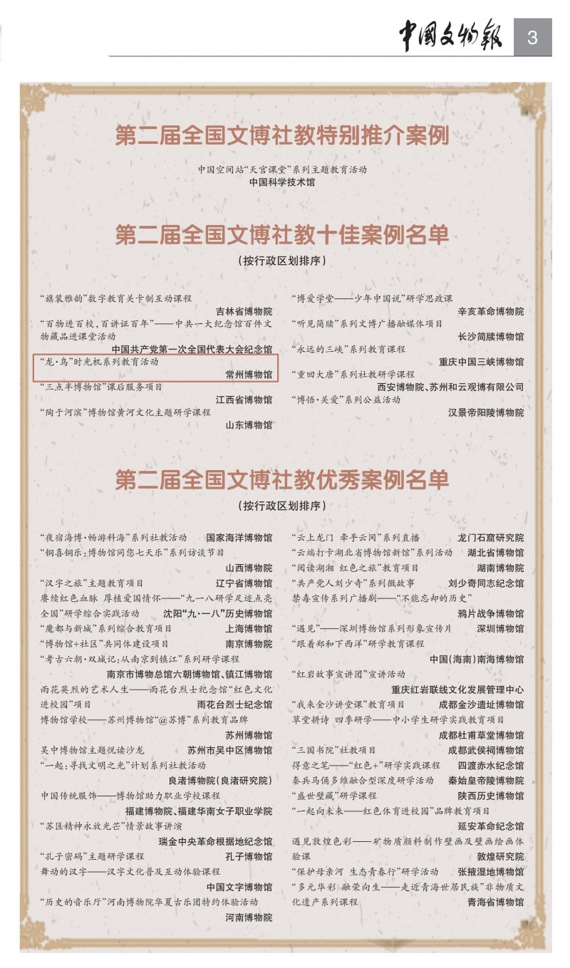 近日,由中国文物学会、中国文物报社联合主办的第二届全国文博社教十佳案例宣传推介活动终评会在北京举办。来自文博单位、科研院所、文博企业的12位专家对入围终评的45项案例逐项观看视频、审核材料、充分讨论。经专家评议,1项特别推介案例、10项十佳案例,34项优秀案例名单出炉。常州博物馆“‘龙·鸟’时光机系列教育活动”荣获第二届全国文博社教十佳案例。