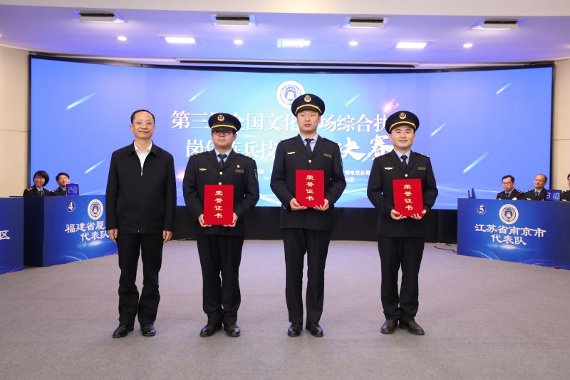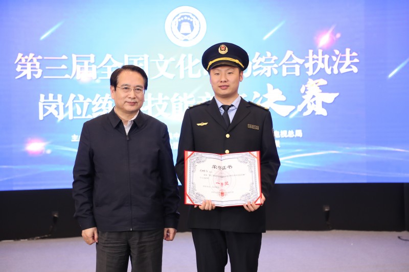由文化和旅游部、中共中央宣传部、司法部、国家广播电视总局、国家文物局、 中华全国总工会、共青团中央、全国妇联8部门主办的第三届全国文化市场综合执法岗位练兵技能竞赛决赛,4月27日在北京落下帷幕,执法支队周鹏飞勇夺案卷纠错课目考试个人单项一等奖、个人全能一等奖的好成绩,中华全国总工会副主席、书记处书记、党组成员谭天星和国家文物局党组副书记、副局长顾玉才亲自为周鹏飞颁奖。
