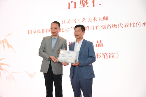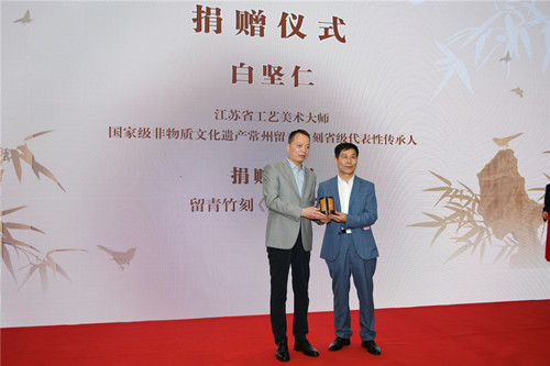 严俊局长、马达会长先后致辞。本次展览的参展艺术家、白氏留青竹刻传人白坚仁、王志伟、于常青分别向常州博物馆捐赠作品,常州博物馆副馆长施建刚为他们颁发收藏证书,白坚仁大师致答谢辞。随后,“5·18国际博物馆日”常州市系列活动现场发布。蒋鹏举市长、马达会长、严俊局长、白坚仁大师共同为“5·18国际博物馆日”常州市主会场活动暨“皓月观海 高士临风——白士风竹刻艺术传承展”启幕。