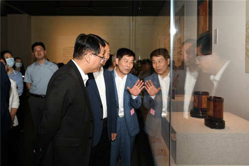 开幕式结束后,领导和嘉宾共同前往博物馆一楼特展厅观看“皓月观海 高士临风——白士风竹刻艺术传承展”。