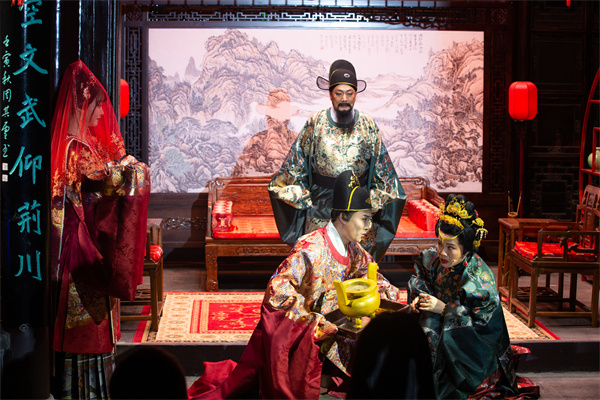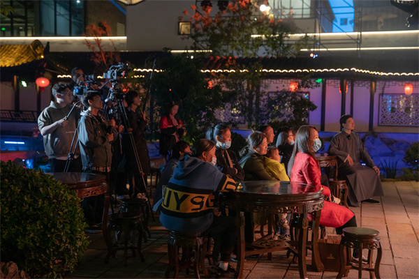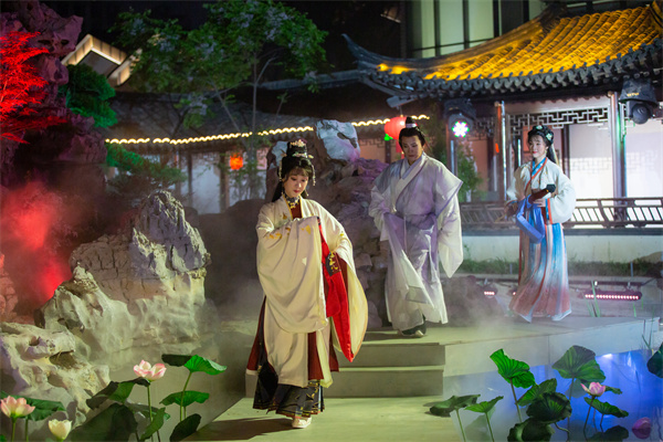 区别于传统演出“演员台上演,观众台下看”的标准范式,《半园·珍珠塔》以山水花木为幕,以亭台楼榭为台,以一步、一景、一幕为演出形式,将园中景、景中戏、戏中人巧妙融合。