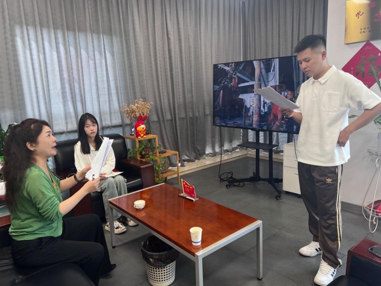 甘俊锐抽到决赛选题“田明”后,常州市委宣传部立刻组建红色故事大赛工作专班,进行任务分配,制定时间表,全力备赛。迅速赶赴扬州市江都区油田现场采访田明,深挖“大故事”背后鲜为人知的“小细节”。采访工作得到江苏油田的倾力支持,特别是主人公田明正在井上作业,在极繁忙的工作中抽出时间与常州采访团深度交流,讲述了一个个生动感人的鲜活故事。在掌握足够素材后,甘俊锐立刻开始撰写人物故事,拍摄宣讲视频,团队帮助一遍遍修改、打磨、背诵、试讲,直至上场前一刻。