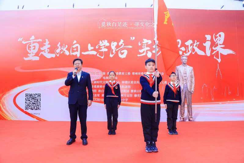 3月11日,“觅秋白足迹 寻文化之根——重走秋白上学路实境思政课”启动仪式在钟楼区民元里壹号举行。市委常委、宣传部部长陈志良为学生代表授旗,并宣布“重走秋白上学实境思政课”正式启动!