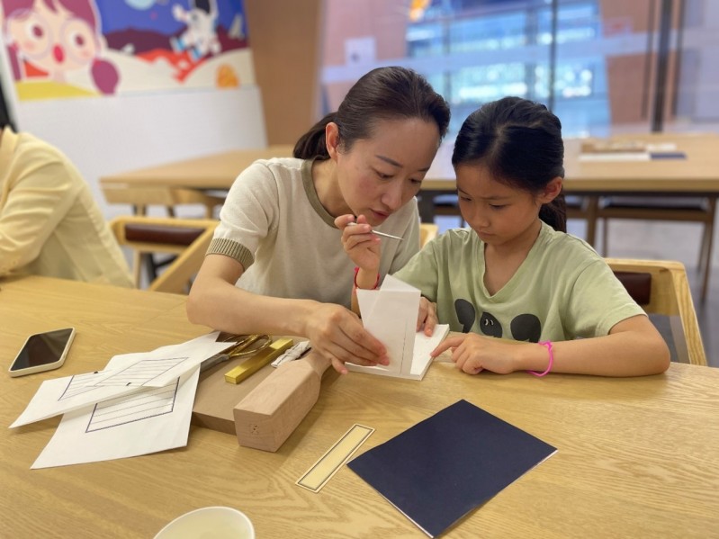 细观古籍装帧形式的演变历程之后,老师带大家体验以线装书为样本的古籍装订过程,经过折页、齐栏、穿纸捻、裁边、装书皮、打眼、订线,小朋友们在老师的带领以及家长的帮助下,自己动手完成了一本线装书的缝制,在场的家长、孩子体会到古籍的珍贵和魅力,由此产生了对中华优秀传统文化的浓厚兴趣。