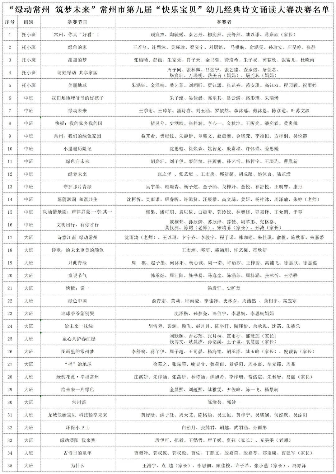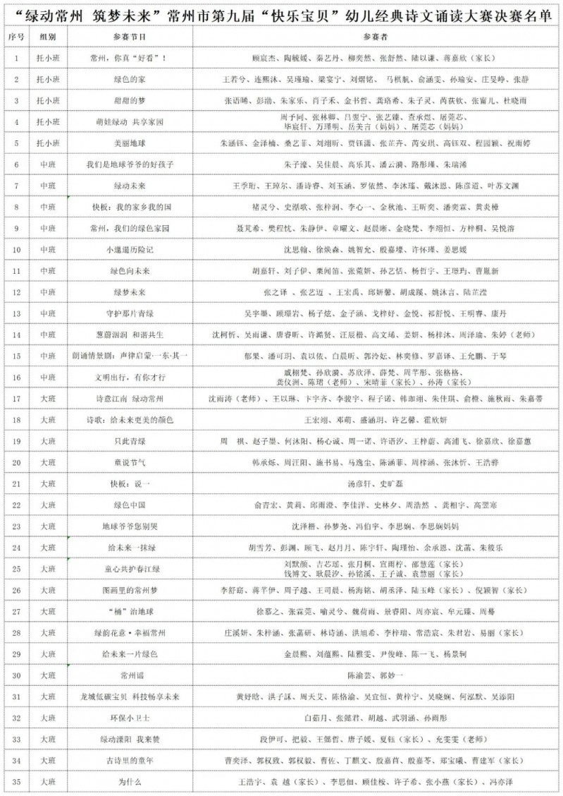 自此,常州市第九届“快乐宝贝”幼儿经典诗文诵读大赛的初赛已全部结束,在评委组的评分推荐和商议下,进入决赛的名单已新鲜出炉!