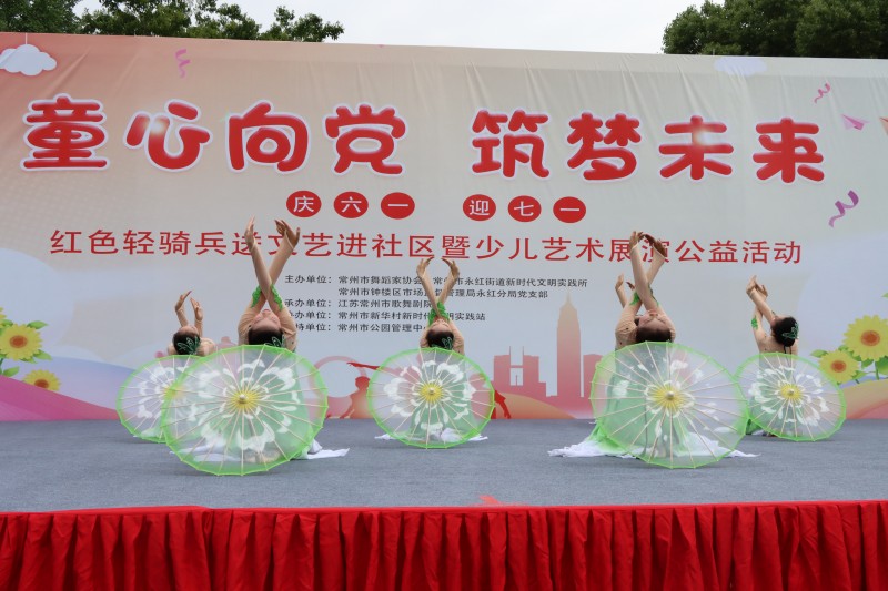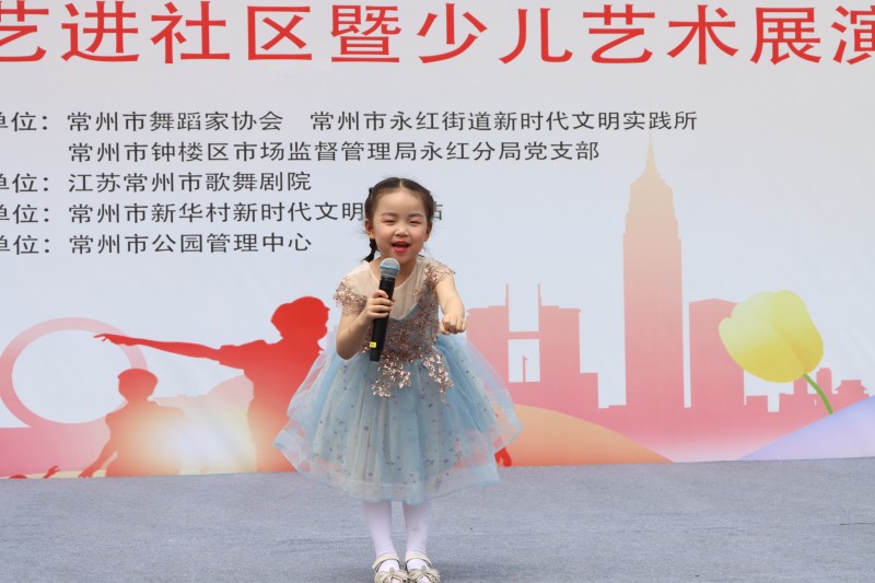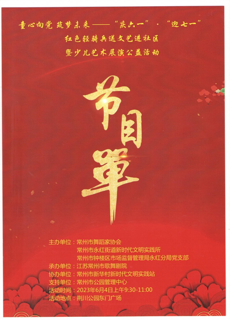 6月4日上午,荆川公园东门广场举办童心向党 筑梦未来 ——“庆六一”·“迎七一”红色轻骑兵送文艺进社区暨少儿艺术展演公益活动。此次活动由本次活动由常州市舞蹈家协会、常州市永红街道新时代文明实践所、常州市钟楼区市场监督管理局永红分局党支部联合主办,江苏常州市歌舞剧院承办,共15个节目进行展演。