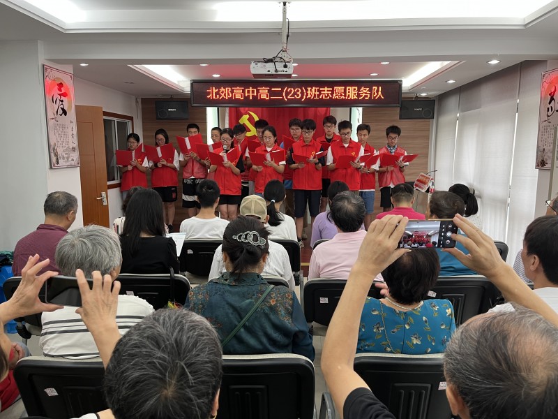 北郊高中高二(23)班志愿服务队同学们表演了朗诵《穿越时空的对话》,并庄严宣誓:要向瞿秋白学习,永远听党话、跟党走,做一名肩负起民族伟大复兴的好少年,薪火传承,一起向未来。