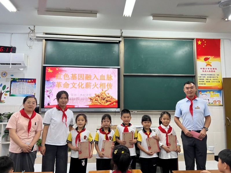 为落实“大思政课”建设,增强未成年人思想道德教育与文化素质教育,促进未成年人的健康成长,9月13日下午,常州三杰纪念馆“红领带”宣教员李鹏、金丽娜来到常州市中天实验学校少先队开展“讲述三杰故事 传承红色基因”主题活动。