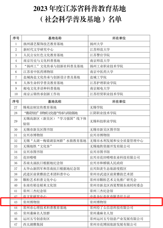 江苏省科协、省社科联、省科技厅、省教育厅近日联合发布了《关于认定2023年度江苏省科普教育基地的通知》(苏科协发〔2023〕135 号),认定316家单位为2023年度江苏省科普教育基地。其中常州博物馆被认定为江苏省科普教育基地(社会科学普及基地),常州少儿自然博物馆被认定为江苏省科普教育基地。