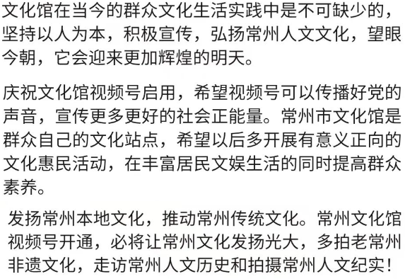 9月17日开始的常州市文化馆视频号开号活动于22日结束!在活动过程中,我们收到了很多热心的新老粉丝提出的宝贵意见和建议,以及真挚的祝愿!