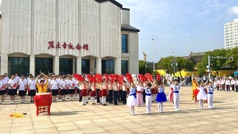 升旗仪式后,常州市第二中学的同学和怀德苑小学太雷讲解团的同学给大家带来精彩的诗歌朗诵《三杰不朽》、爱国主义歌曲合唱及戏剧表演《绣红旗》。广场上红旗招展、人头攒动,处处洋溢着欢乐祥和的节日气氛。最后由纪念馆讲解员带领大家打卡青年学习社。