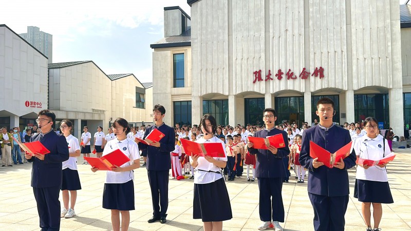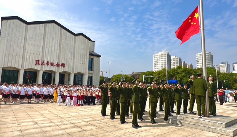 上午9:00,在张太雷纪念馆北广场上,升旗仪式正式开始,奋进的主旋律和嘹亮的口号声中,仪仗队步履铿锵地穿过广场走向升旗台。当雄壮的《义勇军进行曲》响起,鲜艳的五星红旗在秋日暖阳中冉冉升起。这一刻,所有人面对国旗肃立致敬,齐唱国歌,通过嘹亮的歌声抒发真挚浓厚的爱国情怀。