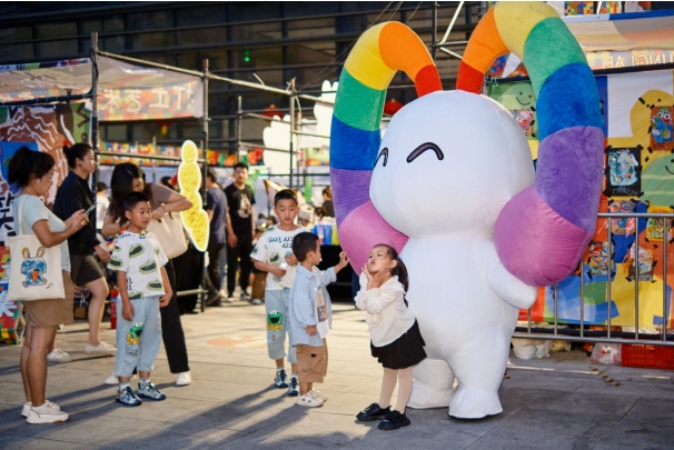 在互动装置中“钓一钓”、“套一套”、“挖一挖”,体会市集的热闹和乐趣。现场惊喜多多:“W”彩虹兔、小丑气球、笑脸贴纸、多彩棉花糖、一朵小红花……艺术在“买卖”中起飞,儿童让常州更美好。