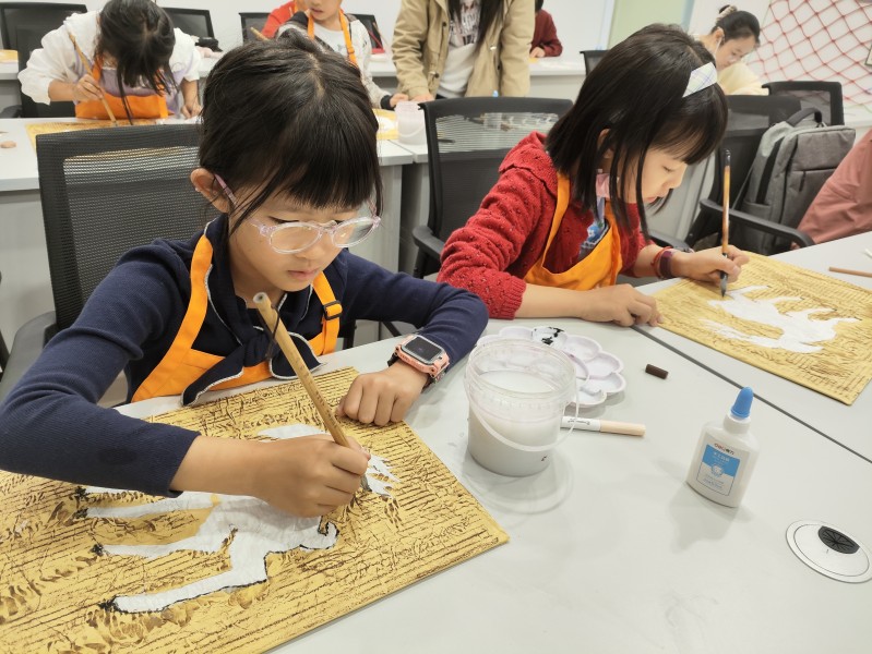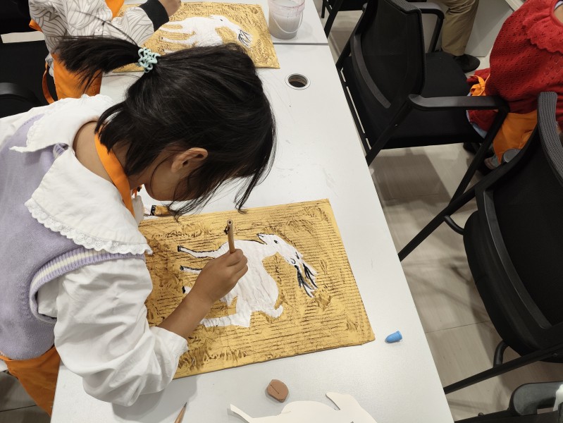 活动中,小朋友们使用与往常不同的创作材料与绘画技巧来绘制九色鹿的形象,在老师的指导下充分发挥牛皮纸的韧性与瓦楞纸板的刚性,创作出属于自己的九色鹿壁画。