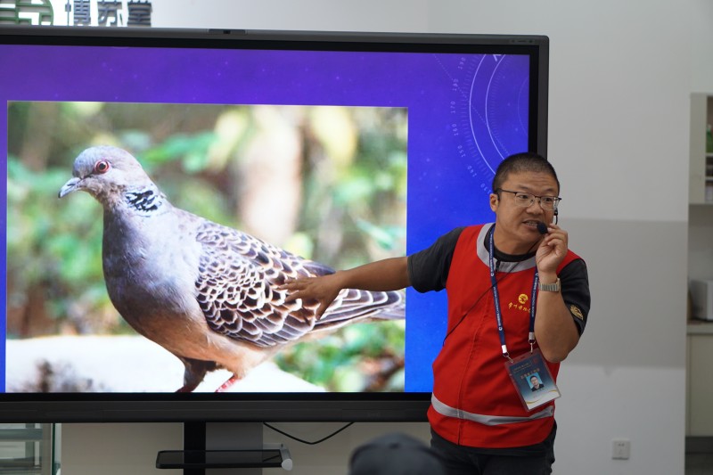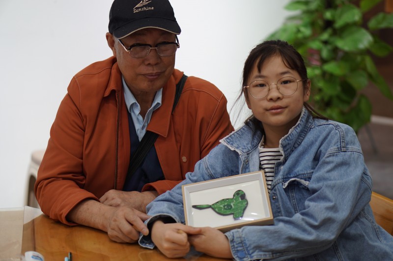斑鸠作为吉祥鸟,历来是人们用来表达祝福老人康泰平安的象征。专场活动选取了“斑鸠”这一主题,结合展厅文物“铜鸠杖头”开展了一场自然、文化与艺术的综合体验课。活动由常博志愿者王建军、吕菲和梅玉联合开展,王建军讲述了斑鸠的家族及生活习性,吕菲由汉代敬老文物“铜鸠杖头”延伸至古代的敬老文化,最后,在梅玉的带领下,参与者欣赏古今中外的斑鸠艺术品,并动手制作了一幅“铜鸠杖头”衍纸作品。老少共学的活动方式,不仅丰富了参与者的知识素养,也增强了亲情,活动现场其乐融融。