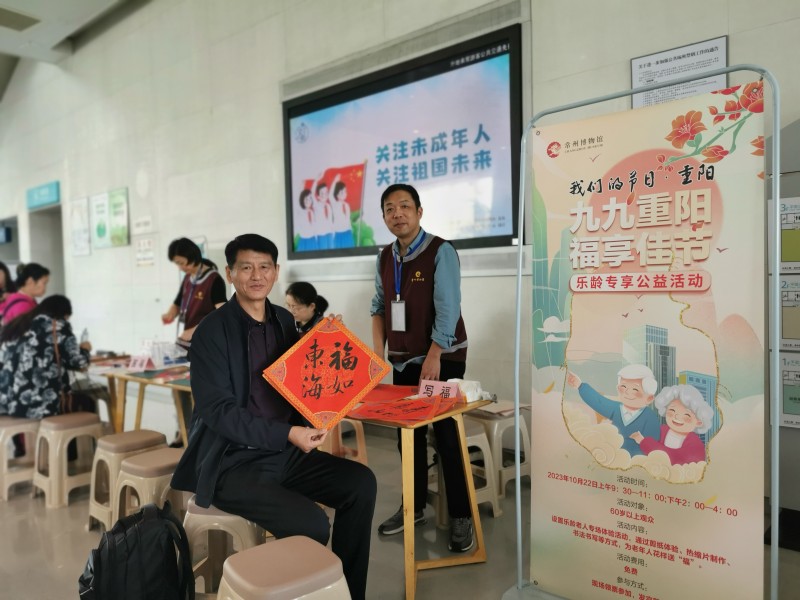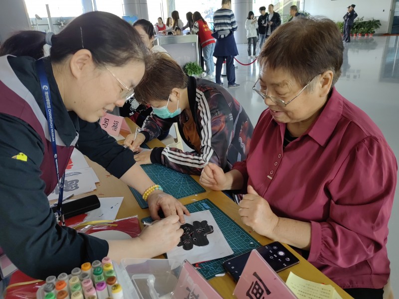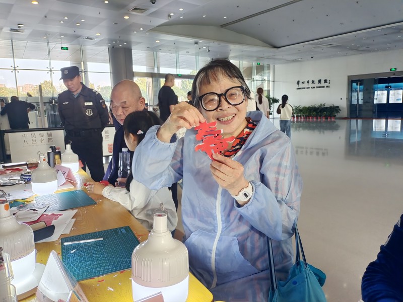 “九九重阳 福享佳节——乐龄专享公益活动”,通过“写福”“剪福”“画福”三种活动形式,为老年观众花样送“福”。在志愿者范永恒、杨泳梅、钱锡梅、张东瑛的辅助下,老人们纷纷参与体验,一幅幅福寿主题的书法、一个个火红的剪纸,一枚枚热缩片诞生,现场洋溢着欢乐的气氛。