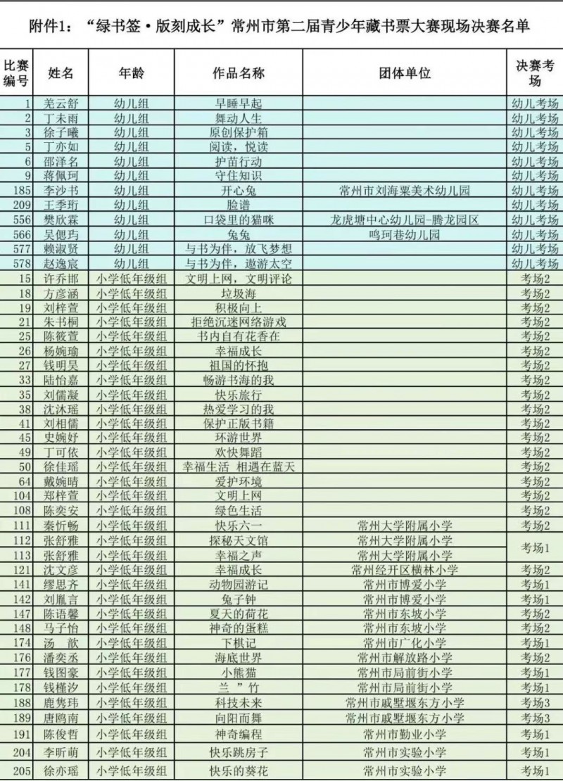 进入“绿书签•版刻成长”常州市第二届青少年藏书票大赛决赛的参赛者。(决赛名单见附件1)