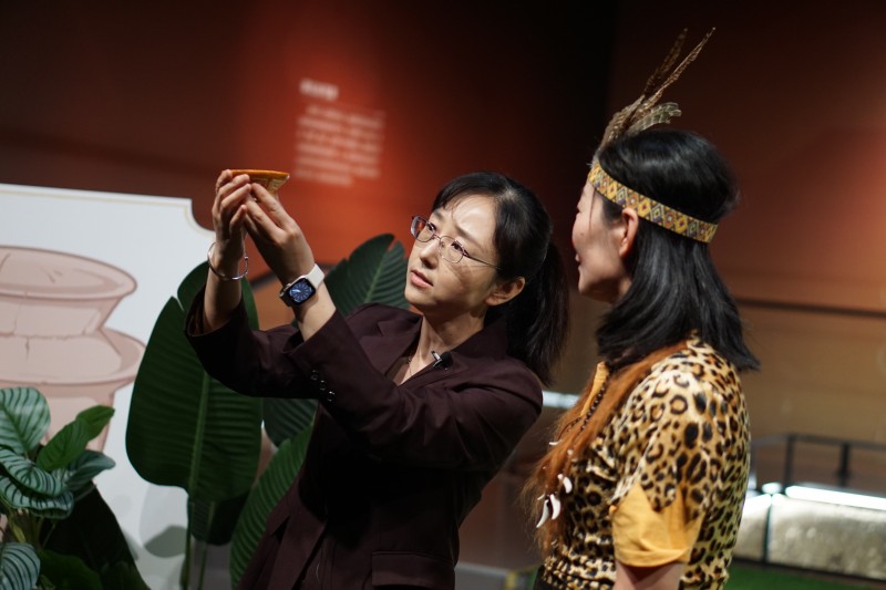 正在向观众朋友们介绍三星村遗址概况的讲解员因缘际会下坐上了时光隧道机,穿梭回了六千多年前的三星村聚落,一段奇妙之旅就此开启……在“回眸三星村”沉浸式展演中,你将跟着讲解员结识巫眩、耀等人,在他们的带领下走进先民们的生活,了解当时人们的生产生活状况,感受遥远时代的社会缔结和文化传承。