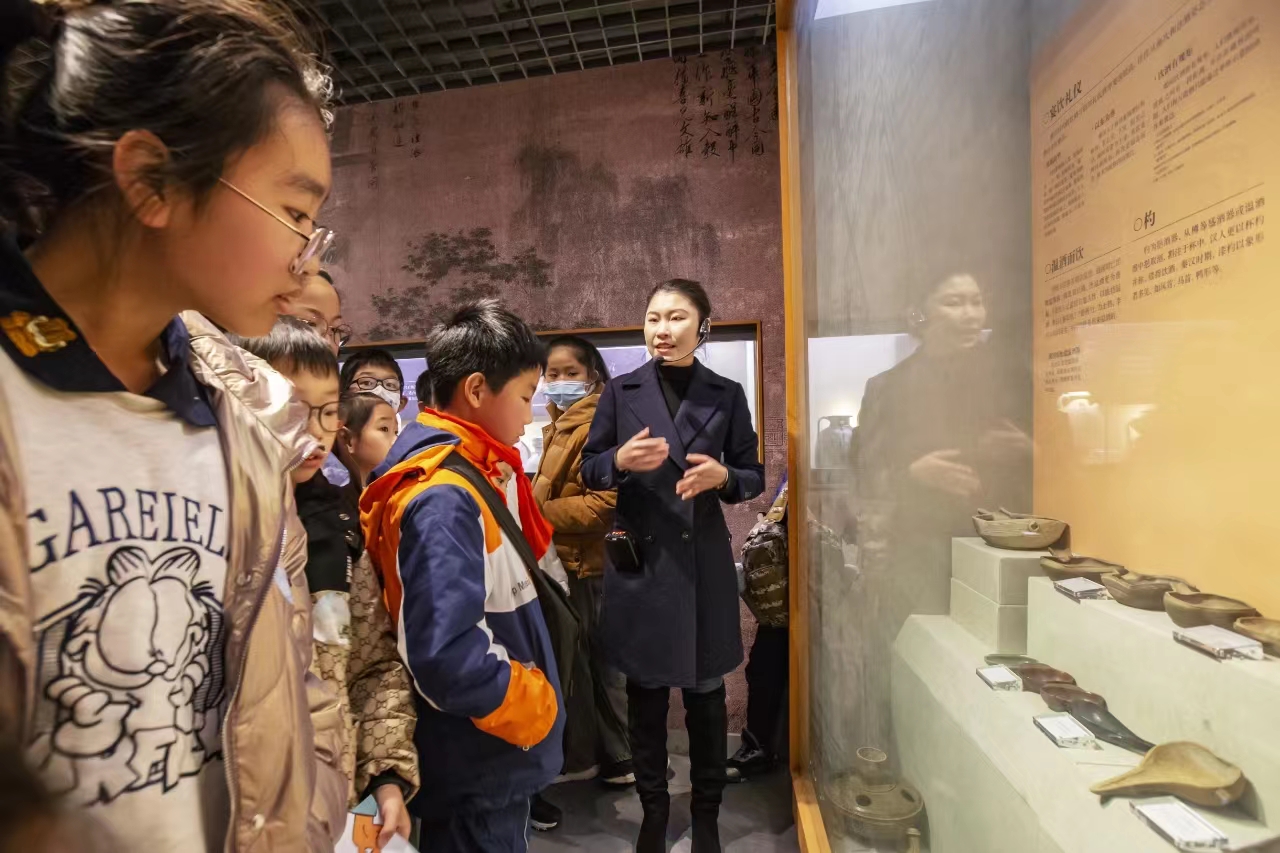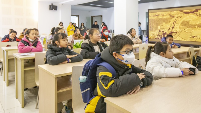 小朋友们在溧阳市天目湖酒文化博物馆认真倾听酒中的历史文化