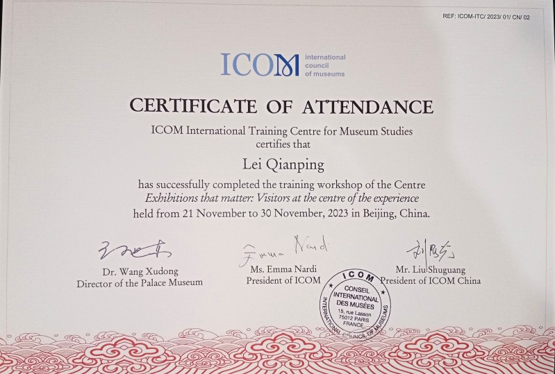 2023年11月21日至30日,国际博协培训中心2023年秋季培训班在故宫博物院成功举办。结业仪式上故宫博物院院长王旭东、国家文物局副局长罗文利、中国博物馆协会理事长刘曙光、国家文物局博物馆与社会文物司司长刘洋、中国博物馆协会秘书长李金光、故宫博物院副院长朱鸿文等领导出席。这是培训中心的第十四期常规培训班,以“好的展览:以观众体验为中心”为主题,历时10天,共招收26名学员。其中,中国学员15名,来自国内8省市及香港特别行政区15家机构;国际学员11名,来自亚洲、非洲、欧洲、北美洲、南美洲11个国家。经过层层申请及激烈的面试竞争,常州博物馆自然部主任雷倩萍获得参加本次培训班资格并顺利结业,也成为江苏省本次培训班的唯一代表。